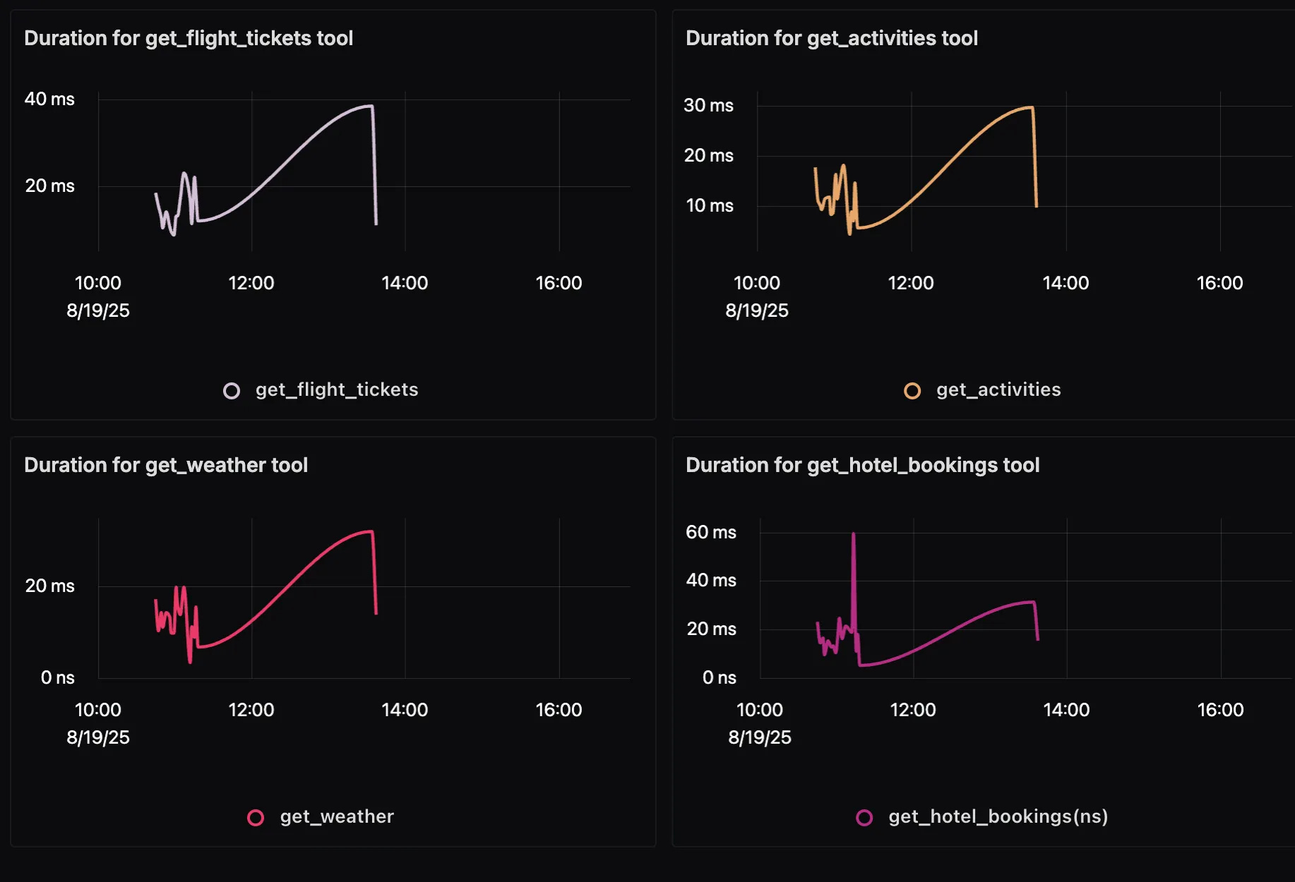 This panel breaks down the latency of each tool: get_flight_tickets, get_hotel_bookings, get_weather, and get_activities. By tracking the 95th percentile duration, you can quickly spot which external API is the slowest under peak load and decide whether caching, retries, or provider changes are needed.