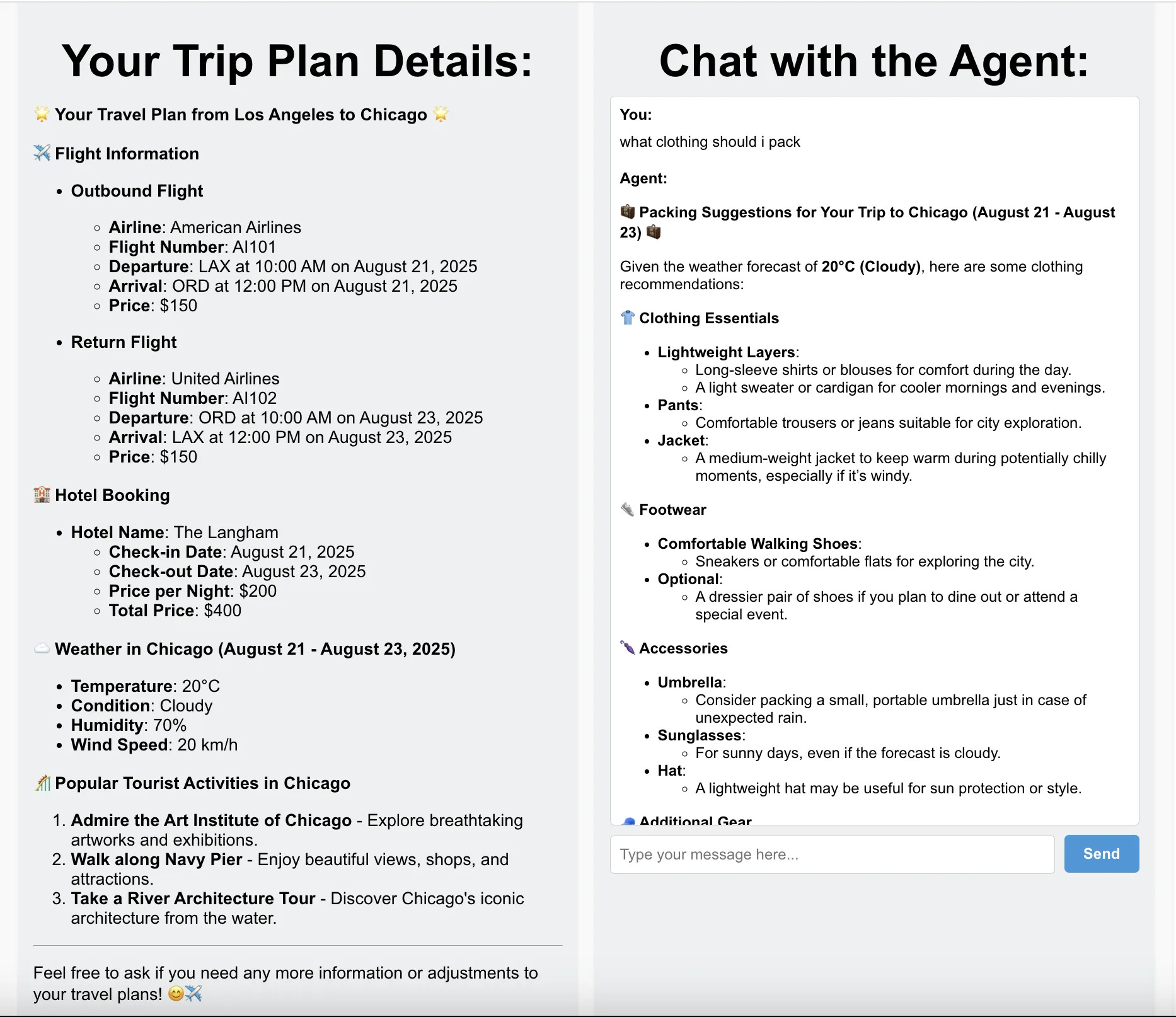 Under the hood, the app uses LangChain’s agent framework to orchestrate multiple tool calls: one for flight tickets, one for hotels, one for weather, and one for activities. The LLM reasons over the responses from these tools and stitches them together into a coherent itinerary.