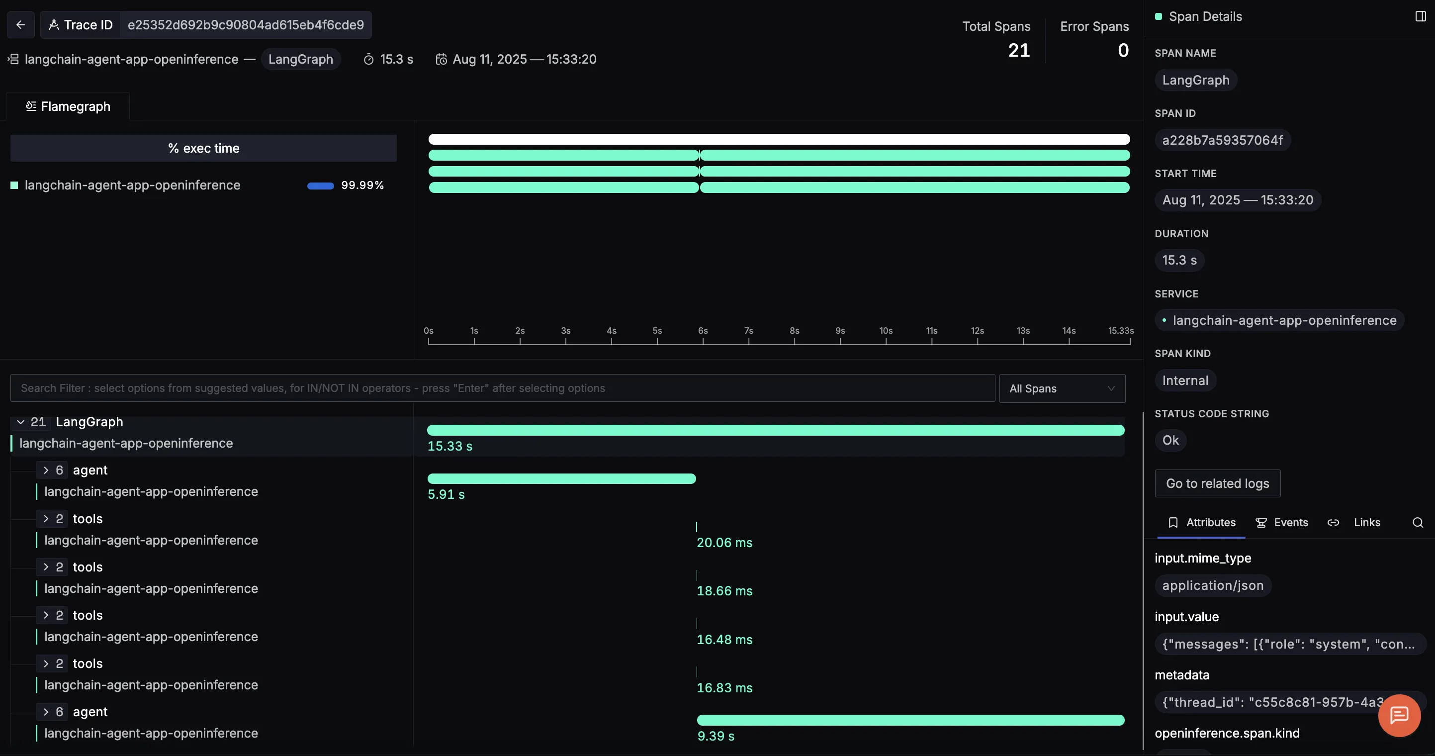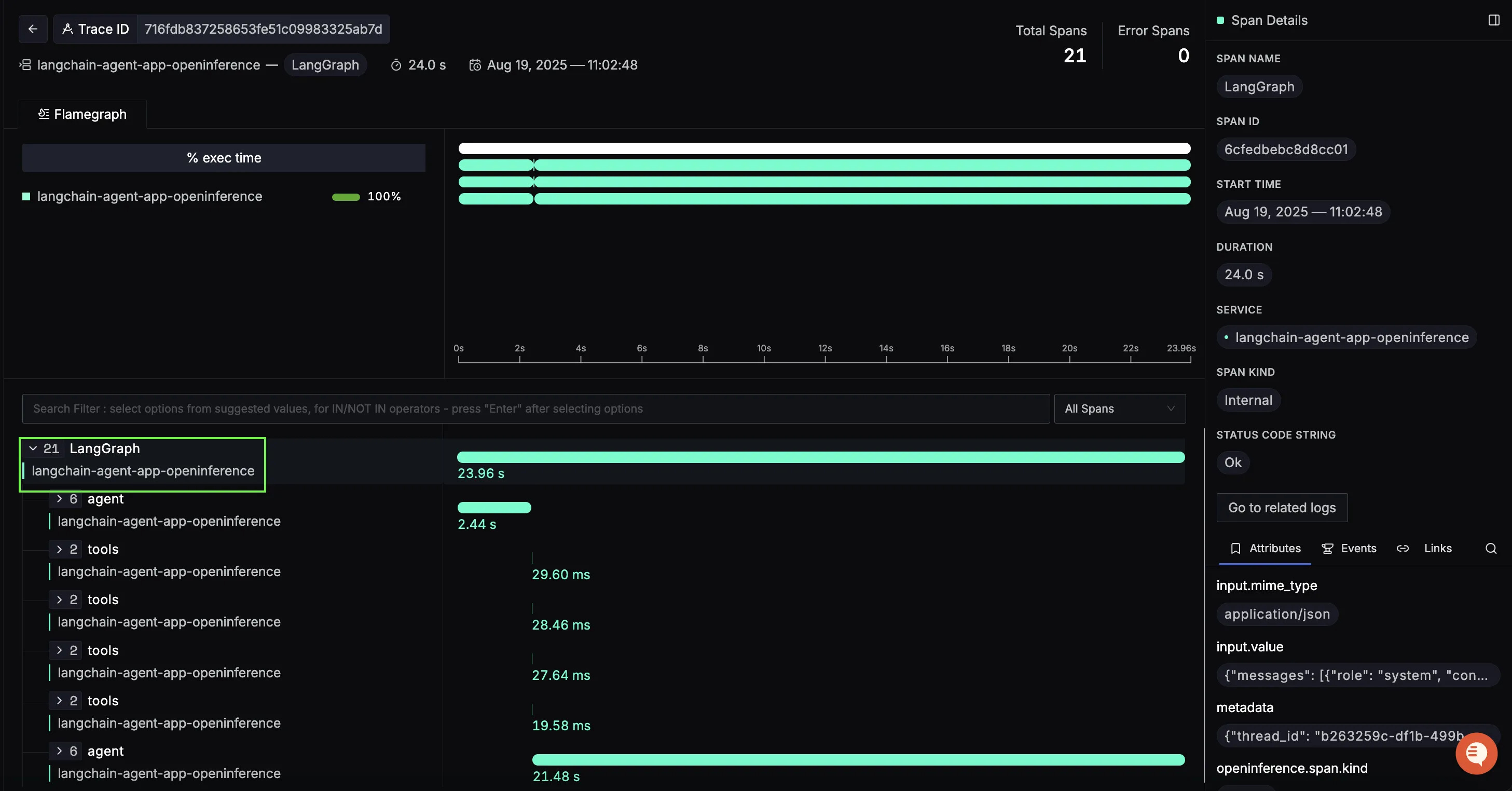 Nested inside the LangGraph span is the agent span, which captures the LLM’s reasoning steps. This includes the decision-making process: when to call a tool, how to interpret the results, and whether the loop should continue or terminate.