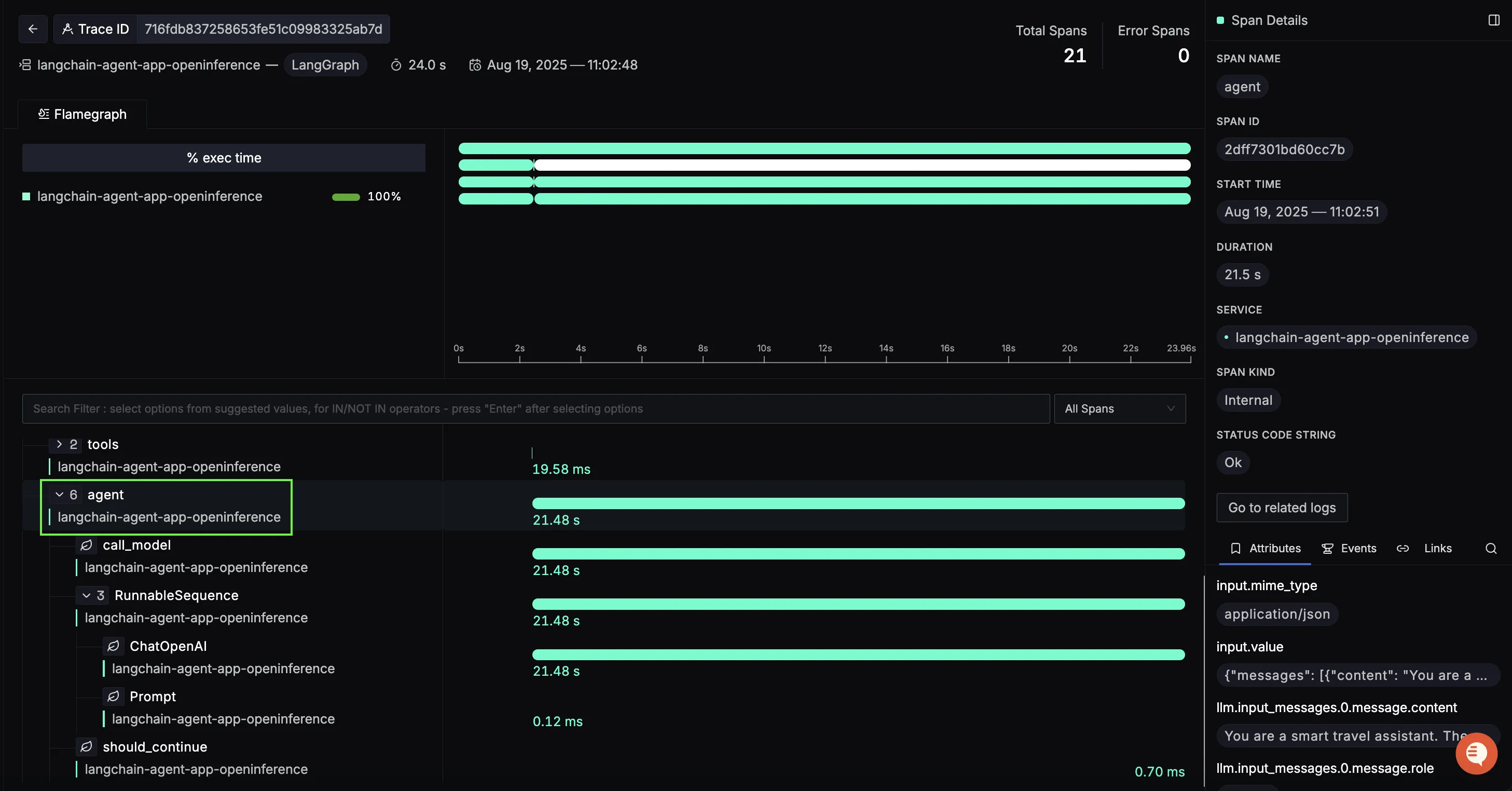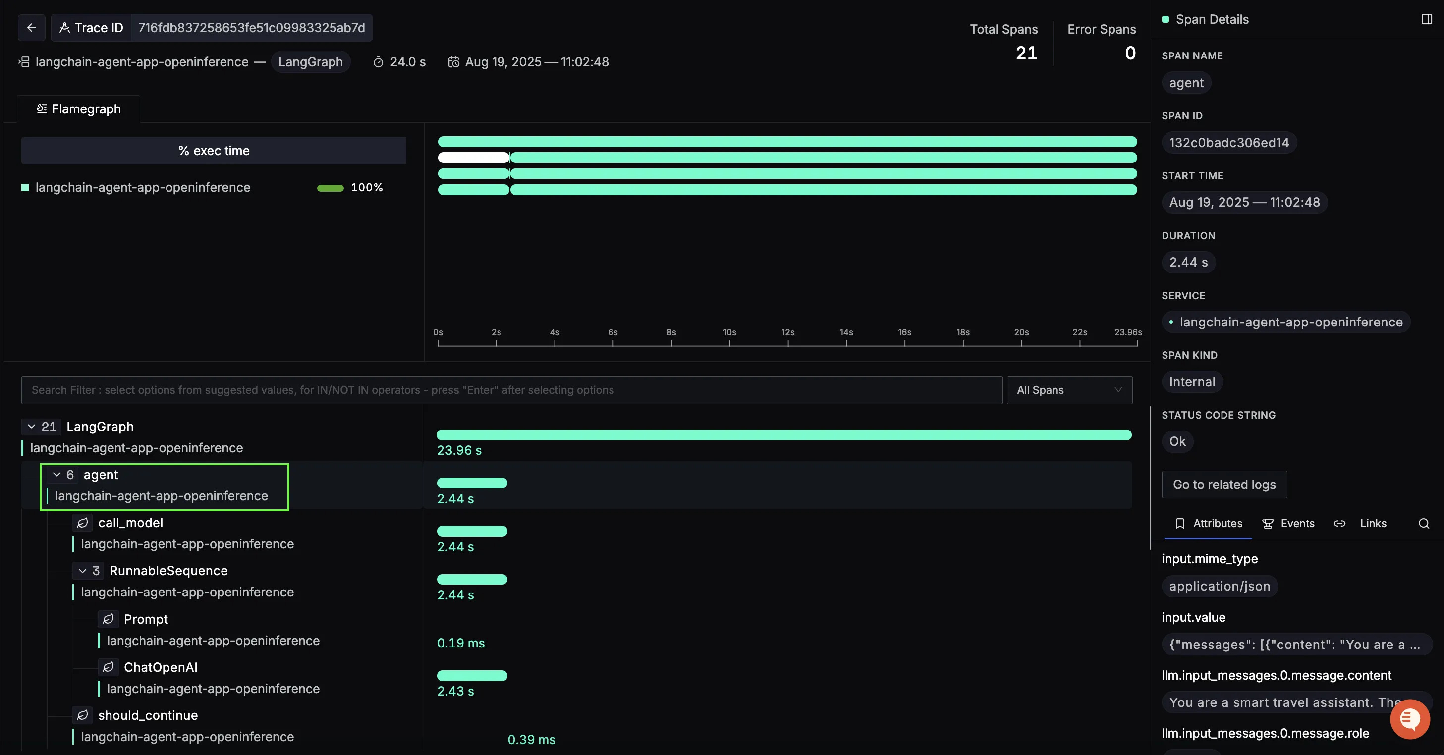 This is where the agent stitches together structured API responses into a user-friendly itinerary. By inspecting this span, you can: