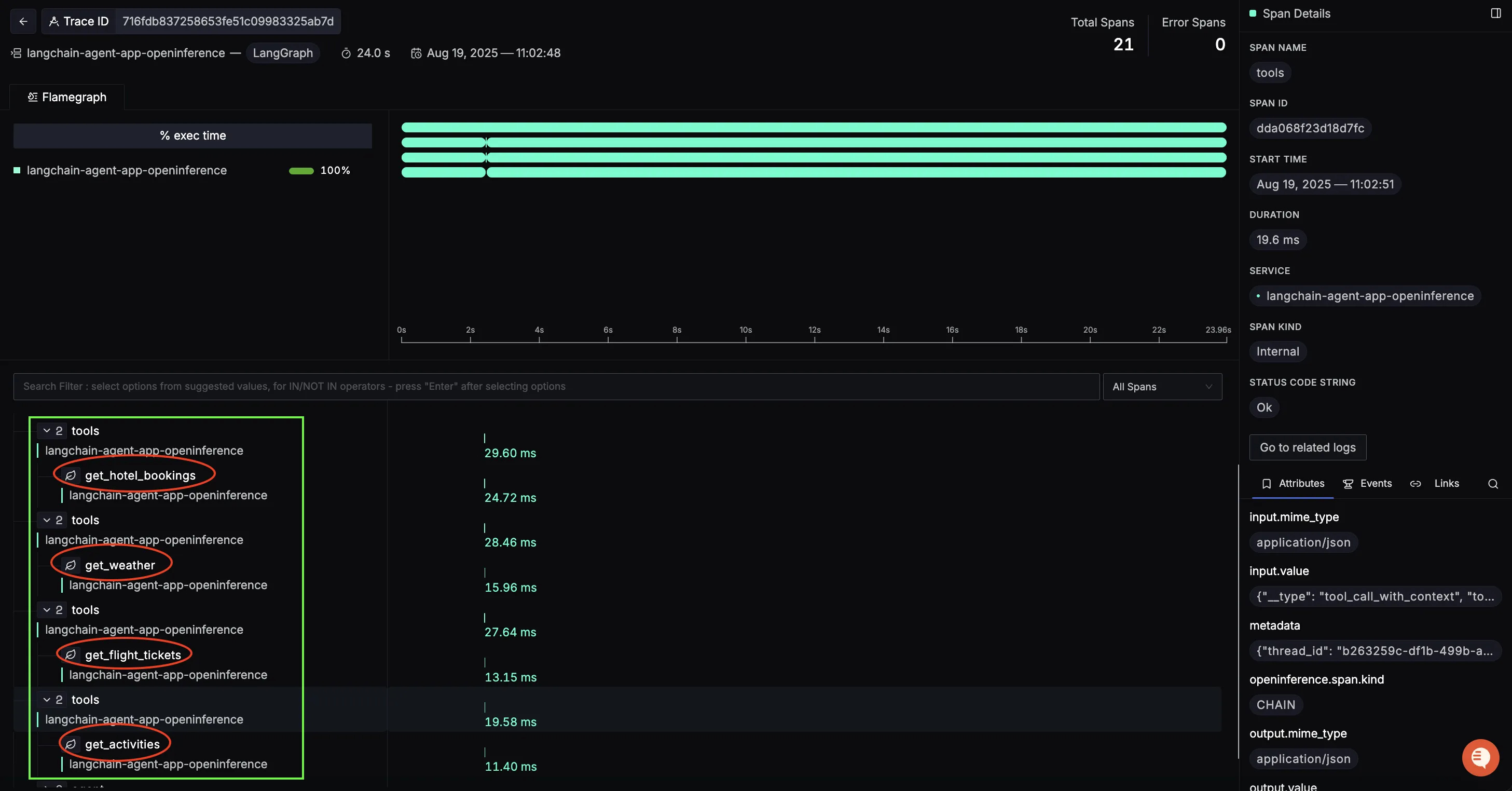 get_flight_tickets→ duration ~13msget_hotel_bookings→ duration ~25msget_weather→ duration ~16msget_activities→ duration ~11ms