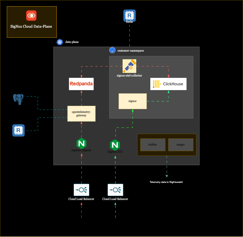 All telemetry ultimately flows into the Castle, which is a dedicated SigNoz instance. This lives in a separate management cluster (the control plane), completely isolated from the data plane clusters where customer workloads run.
