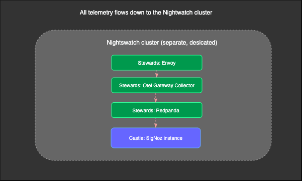 Builders man the Wall, and they run on every node, gathering metrics, logs, and traces from the pods around them. Rangers venture beyond it by actively probing customer endpoints and watching for cluster-level threats like node failures and pod evictions. Stewards keep the supply lines running, and they buffer and forward telemetry from builders and rangers to the Castle, a dedicated SigNoz instance where everything comes together.