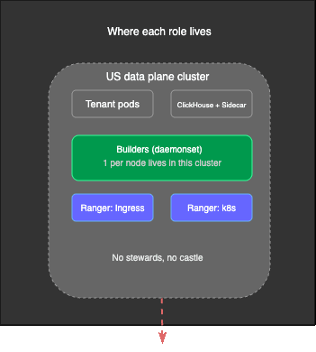 This separation was deliberately implemented to prevent the castle from being affected if one of the region’s clusters crashed. The Castle also monitors itself by running its own builders and rangers.