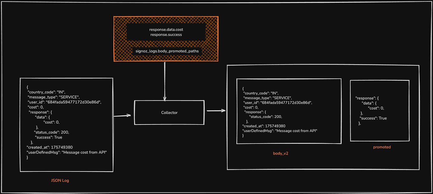 Our first and most direct approach was to solve the problem before the data reached the database. The idea was to intercept incoming logs in our OpenTelemetry collector and transform the JSON structure in-flight.