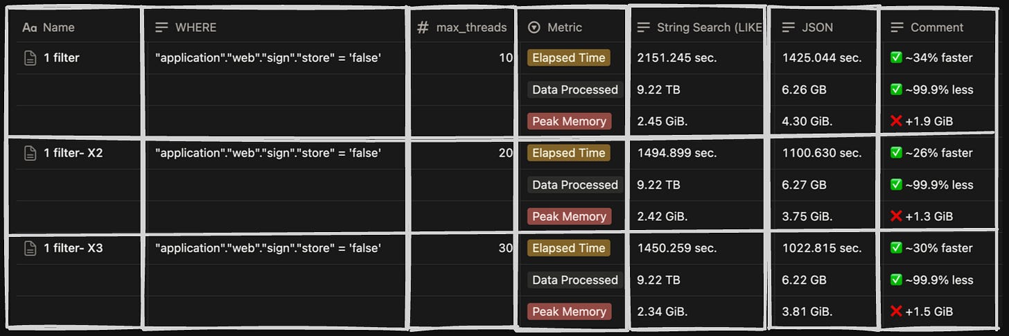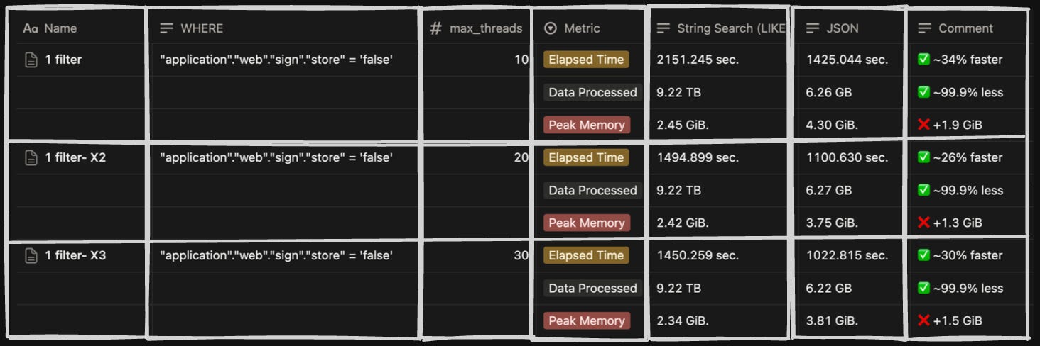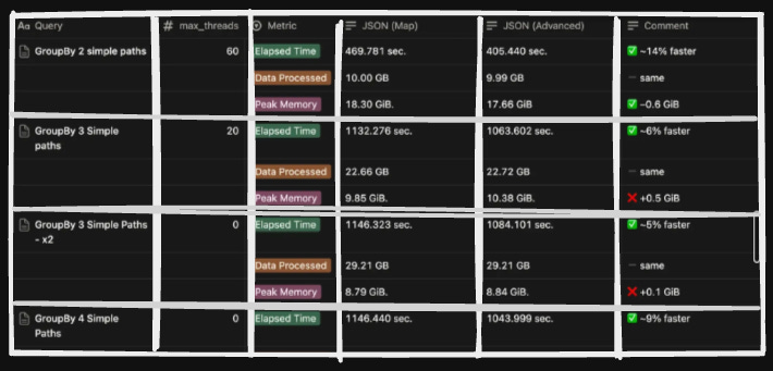 There were some big wins from opting for this format, which included better performance for aggregation and filtering of data; hence, operations like GROUP BY or WHERE clauses on specific JSON fields could be executed with high efficiency.