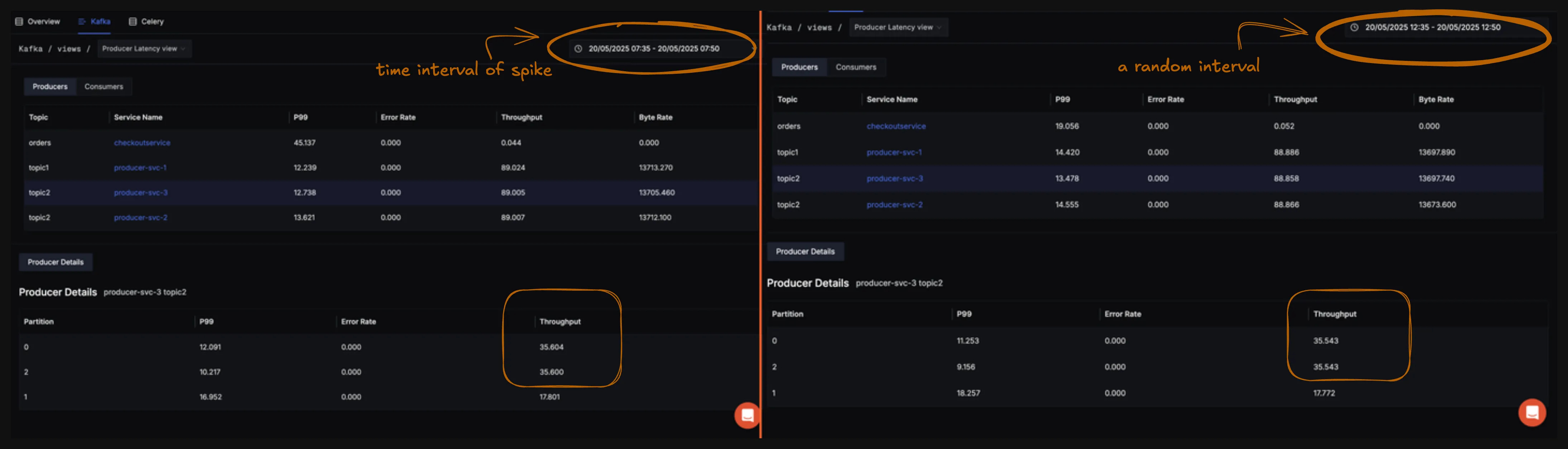 Surprisingly, when the producer throughput was checked, for the interval when the spike was observed vs a random interval, a huge difference was not observed.